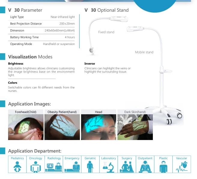 Operating PrincipleInfrared Vein Finder acquires image of subcutaneous veins, the image which results from dealing with image signal is projected onto the surface of the skin. Thus, subcutaneous vein image will be displayed on the skin surface of the corresponding position